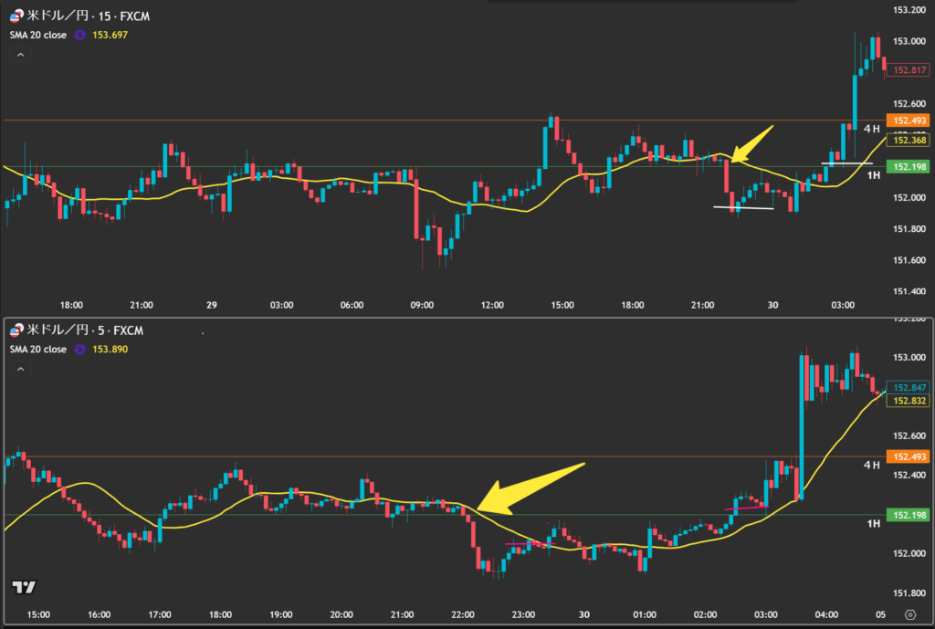 1時間と15分だけで、15分の押し目買いと考えるのはシナリオにない