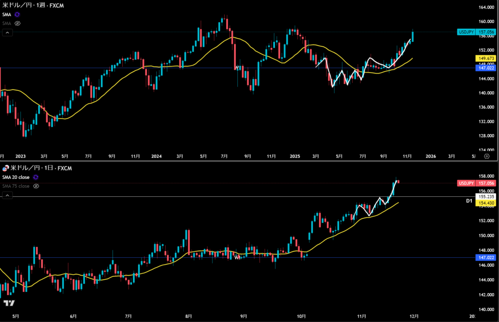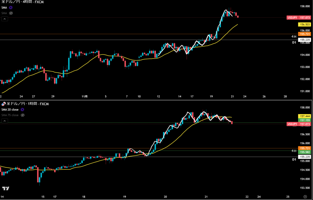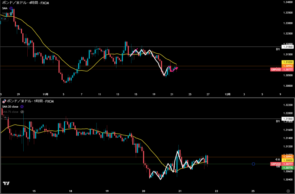 白のラインに日足の押しがいるので下位足ではサポートとして機能する。