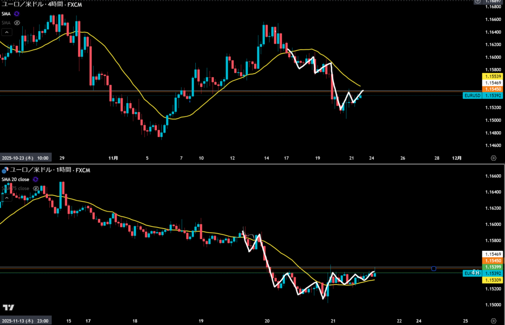 4時間の売り抑え勢力が見える。オレンジ線に。ダブルボトムには小さいしMAもきになる。