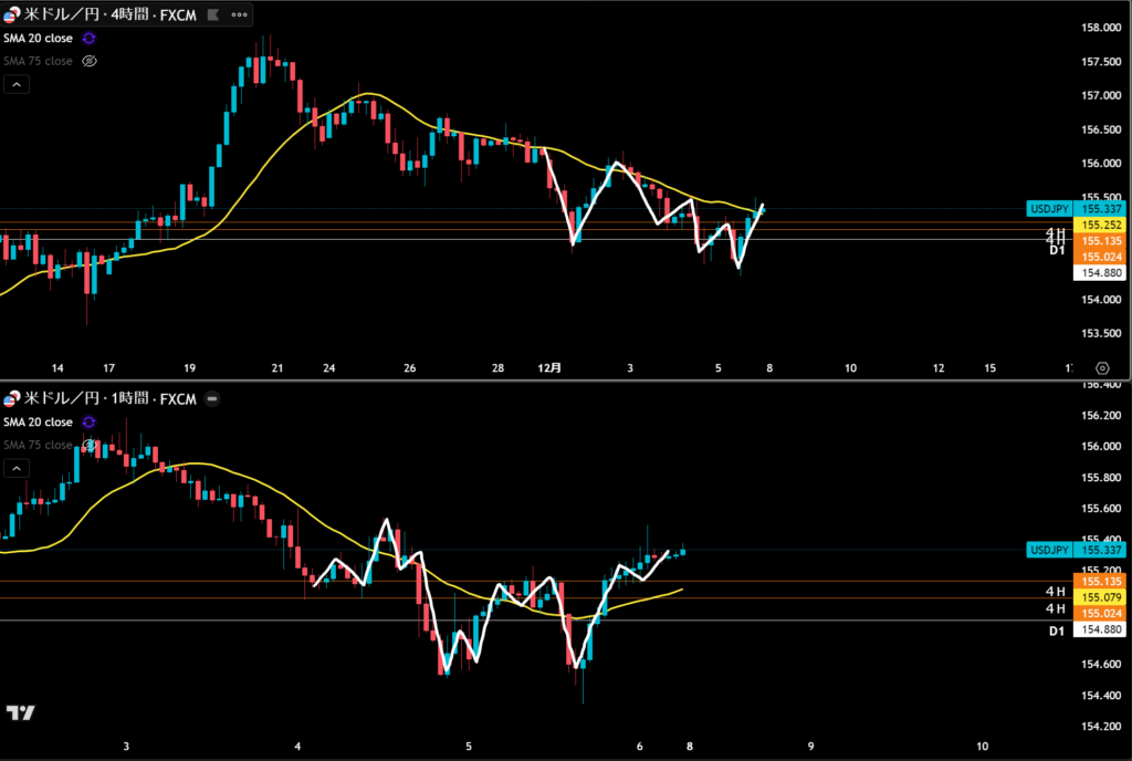 買い支えで止められているとみている勢力もいる。MAは抑えられやすい下位足に影響あるので4時間を見ていく。