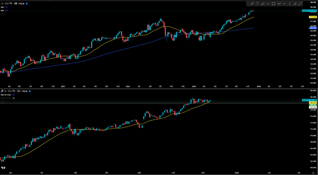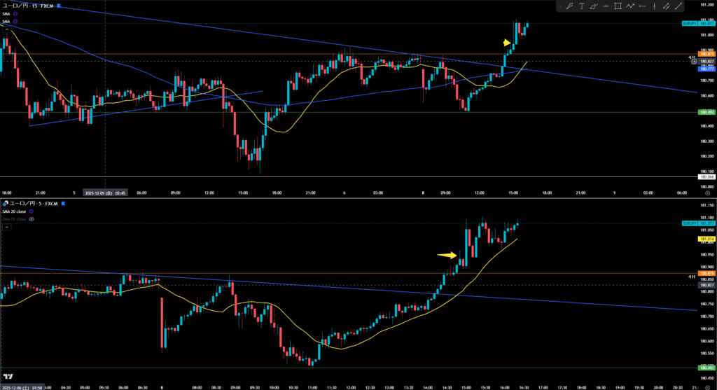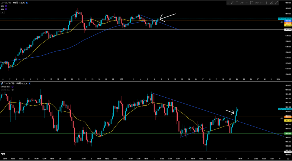 まで来ている現状ではMAでも抑えられている。ロングはレジスタンとして下位足ではリスクになる。