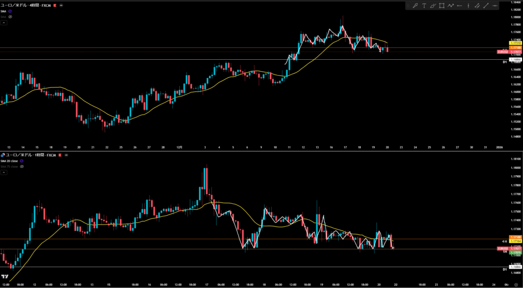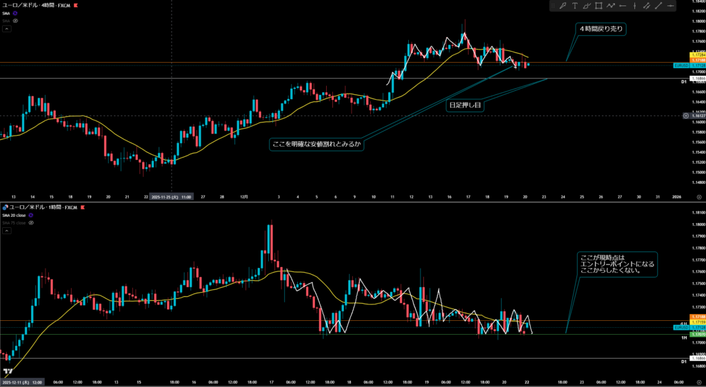 4時間は押し目買い勢力がみえないので今日は静観する。