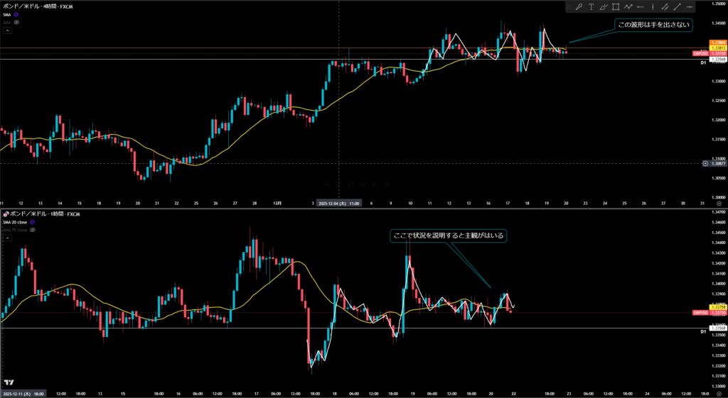 そこは耐えていく。上位足をみて高値付近だし日足の波が4時間で見えているので